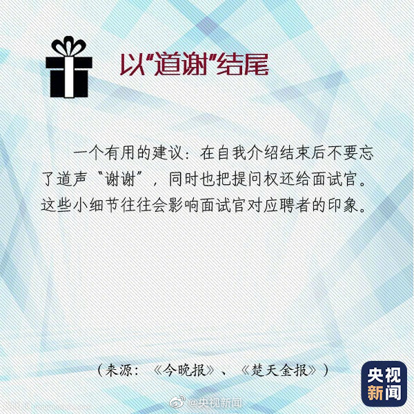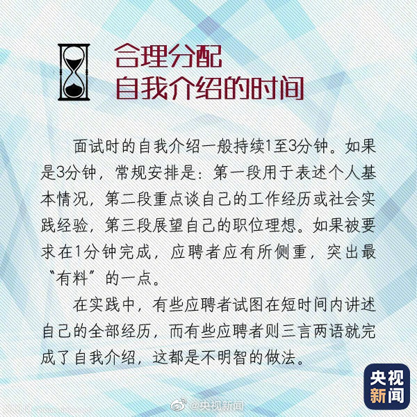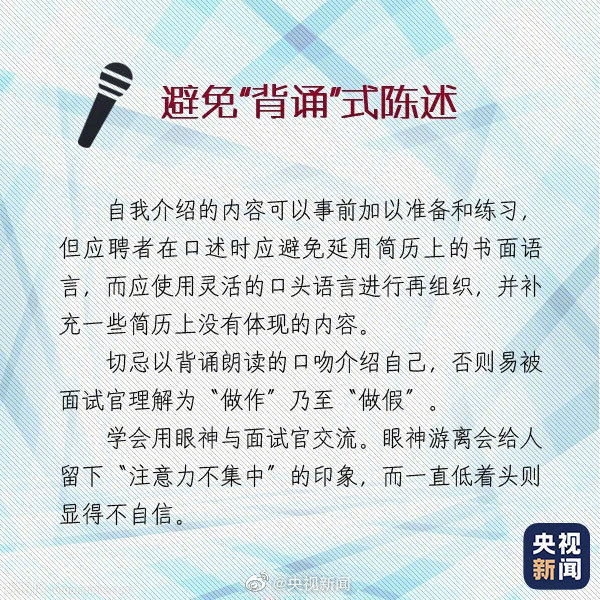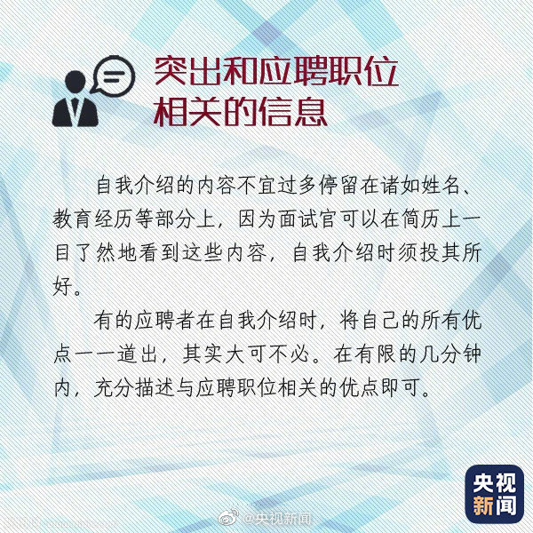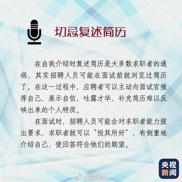 08-19 15:57:52閱讀()央視新聞求職面試時的自我介紹有“四大注意”: