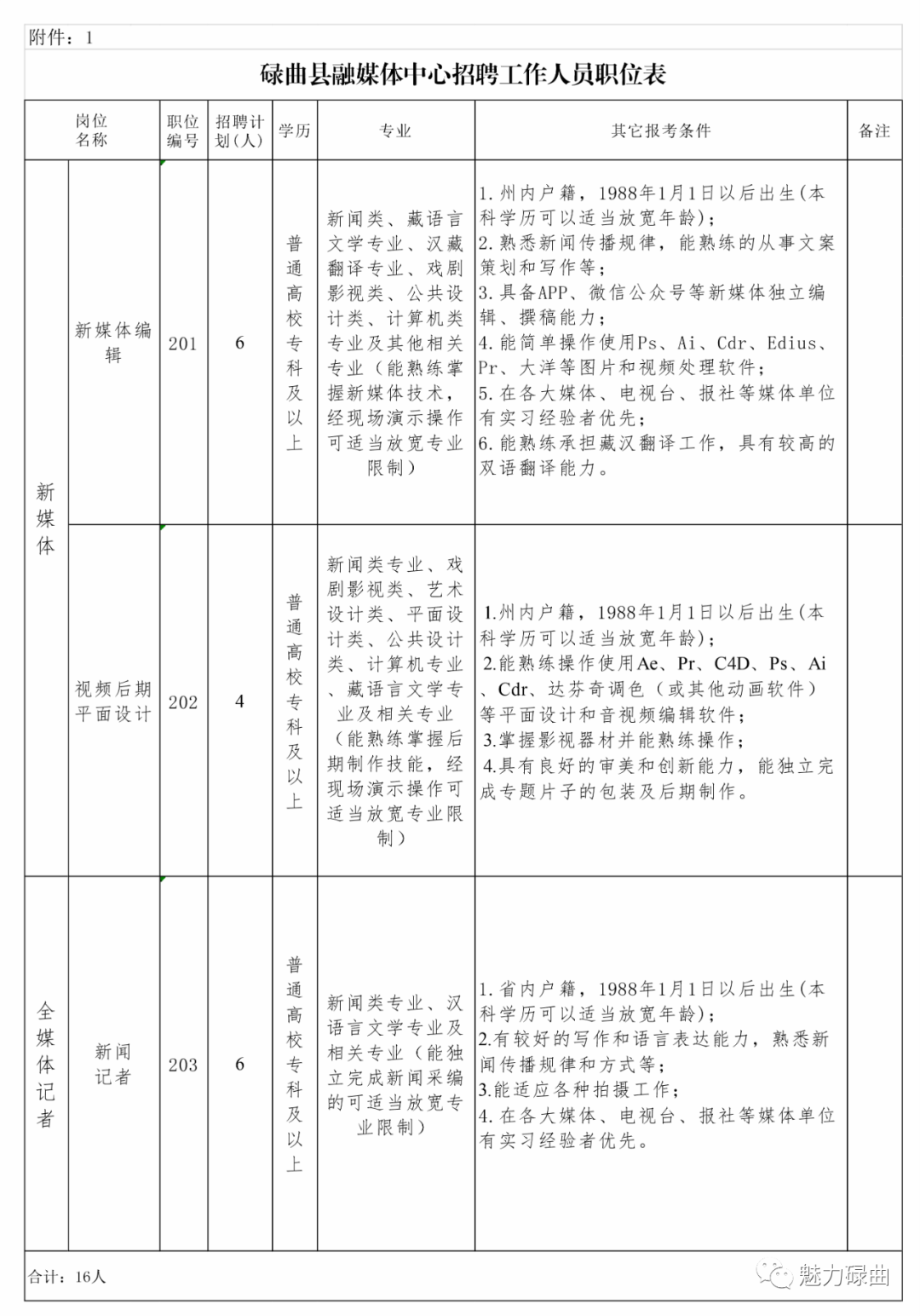 計劃招聘16名。其中新媒體編輯6人(職位編碼201);視頻后期和平面設(shè)計4人(職位編碼202);新聞記者6名(職位編碼203)(詳見附表)。