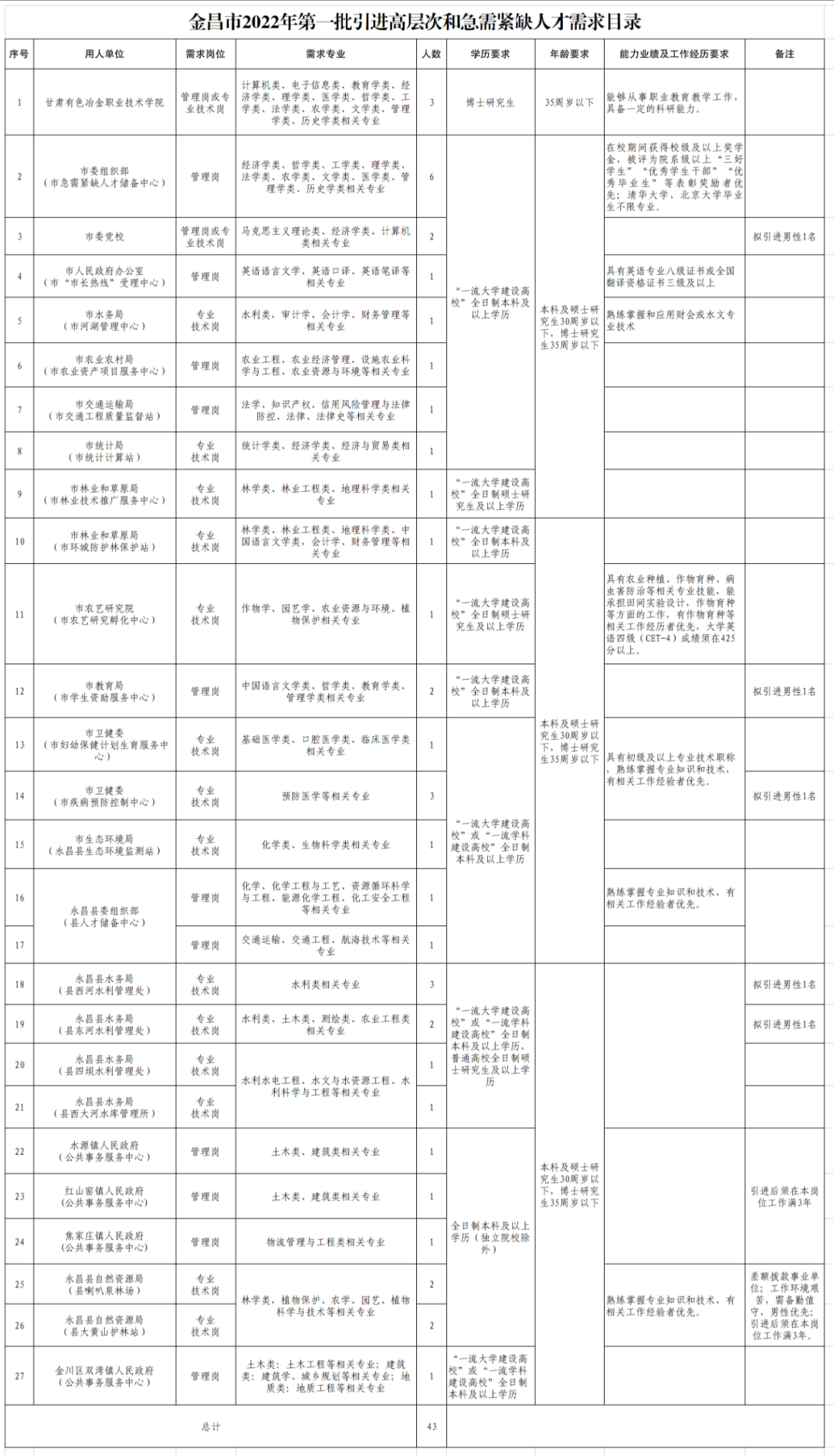 “一流大學(xué)建設(shè)高校”或“一流學(xué)科建設(shè)高校”全日制本科及以上學(xué)歷,且符合我市2022年高層次和急需緊缺人才專業(yè)需求條件的應(yīng)往屆畢業(yè)生(北京大學(xué)、清華大學(xué)畢業(yè)生及博士研究生可不受專業(yè)條件限制),共43名,其中市直26名,永昌縣16名,金川區(qū)1名(詳見《2022年金昌市第一批引進高層次和急需緊缺人才需求目錄》)。對基層邊遠(yuǎn)地區(qū)和個別特殊緊缺的崗位適當(dāng)放寬畢業(yè)院校條件,各崗位招聘條件和要求以需求目錄為準(zhǔn)。