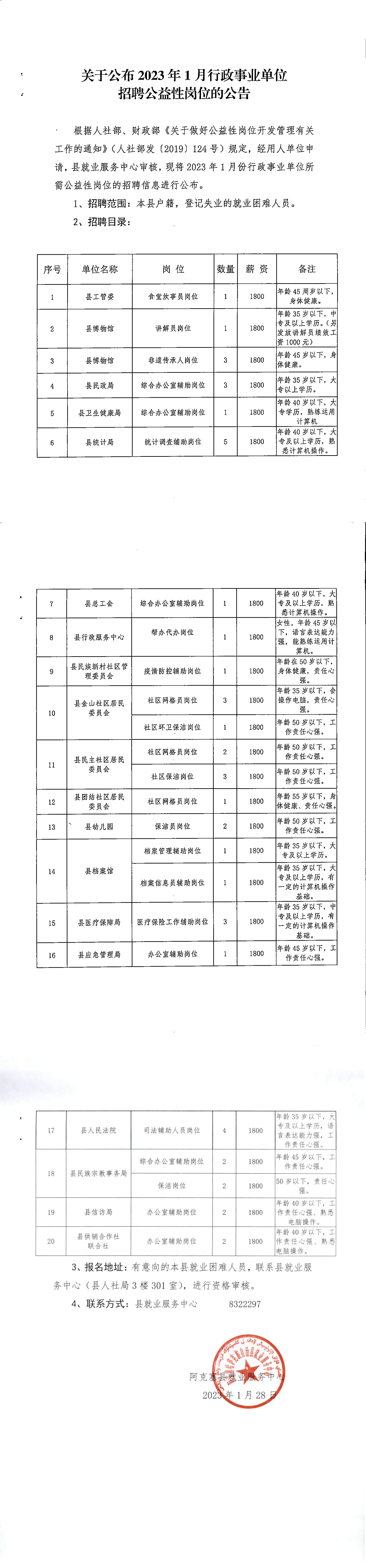 2023-01-31 17:04:23閱讀()酒泉市阿克塞人民政府根據(jù)人社部、財(cái)政部《關(guān)于做好公益性崗位開發(fā)管理有關(guān)工作的通知》(人社部發(fā) (2019) 124號)規(guī)定,經(jīng)用人單位申請,縣就業(yè)服務(wù)中心審核,現(xiàn)將 2023 年 1月份行政事業(yè)單位所需公益性崗位的招聘信息進(jìn)行公布。