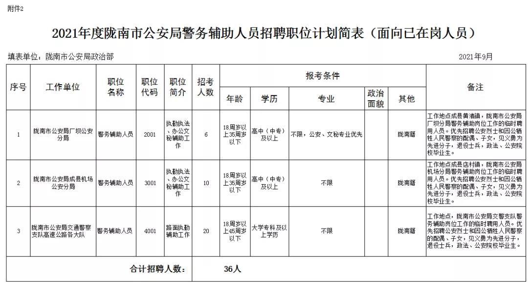 (二)隴南市公安局招聘警務(wù)輔助人員36名(面向已在隴南市公安局廠壩公安分局、機(jī)場分局、交警支隊警務(wù)輔助崗位工作的臨時聘用人員),具體崗位如下: