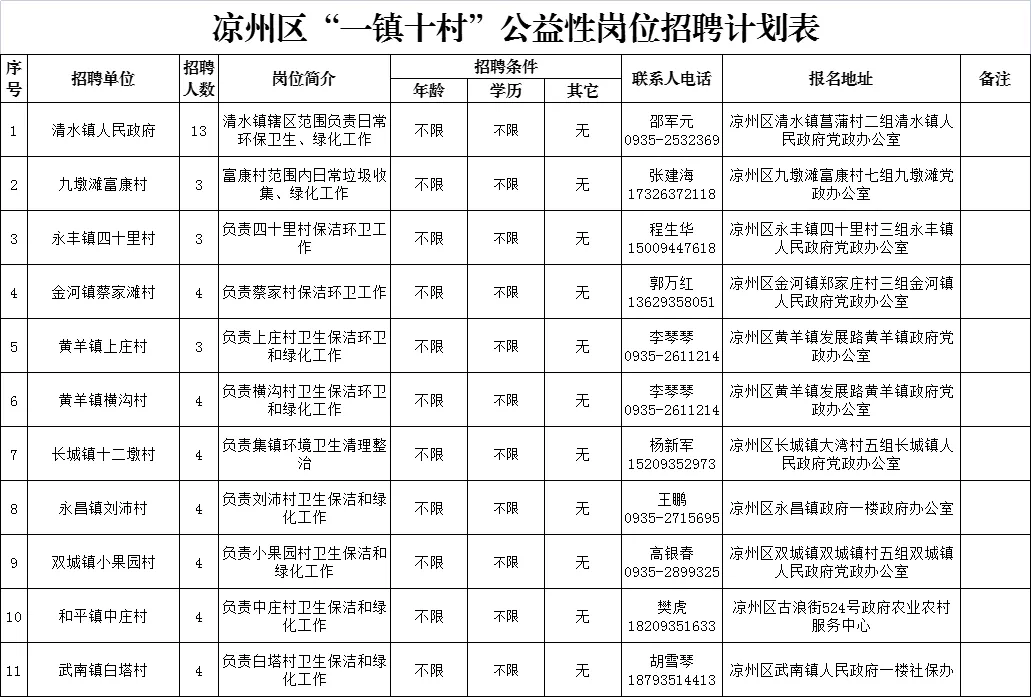 詳見(jiàn)《涼州區(qū)“一鎮(zhèn)十村”公益性崗位招聘計(jì)劃表》。