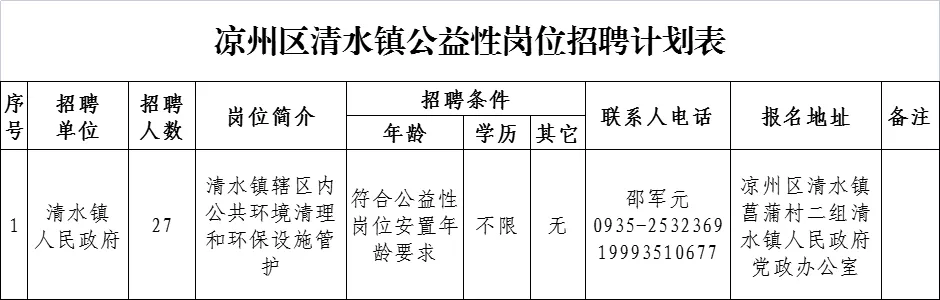 2.報名地點(diǎn):詳見《涼州區(qū)清水鎮(zhèn)公益性崗位招聘計劃表》;