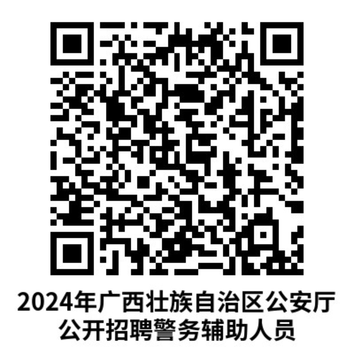 (二)報(bào)名方式:網(wǎng)上報(bào)名。登錄廣西壯族自治區(qū)公安廳政務(wù)網(wǎng)站(gat.gxzf.gov.cn)、廣西壯族自治區(qū)公安廳微信公眾號(hào)點(diǎn)擊鏈接或者掃描公告二維碼進(jìn)入“2024年廣西壯族自治區(qū)公安廳警務(wù)輔助人員招聘網(wǎng)上報(bào)名系統(tǒng)”(https://gx.bmpta.com/gongantingfj/index.aspx),選擇報(bào)考崗位、填寫個(gè)人相關(guān)信息資料,上傳報(bào)名材料完成報(bào)名。