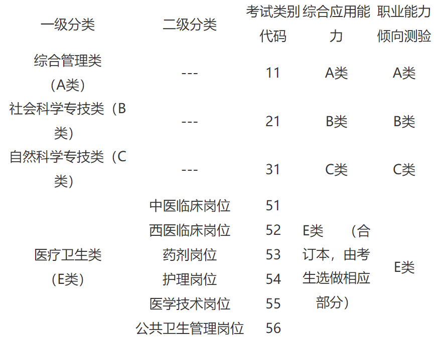 筆試科目為《綜合應用能力》和《職業(yè)能力傾向測驗》兩科,每科分值為150分。按分類進行考試,不同類別的考試使用不同的試題??荚囶悇e分為綜合管理類(A類)、社會科學專技類(B類)、自然科學專技類(C類)和醫(yī)療衛(wèi)生類(E類)四類。