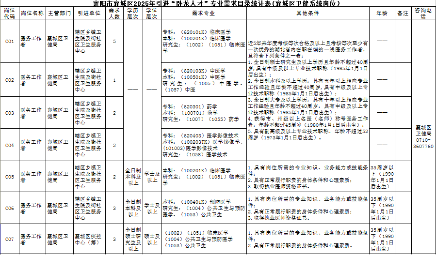 2025-06-06 14:42:00閱讀()襄陽市衛(wèi)生健康委員會襄陽市襄城區(qū)2025年度計劃引進(jìn)“臥龍人才”91名。其中,C類崗位為優(yōu)秀醫(yī)務(wù)工作者引才,共引進(jìn)18名。其中,C01-C04崗面向湖北省內(nèi)在職在編、專業(yè)技術(shù)精湛的一線醫(yī)務(wù)工作者,引進(jìn)10名;C05-C06崗面向普通高校全日制本科及以上學(xué)歷畢業(yè)生,并取得相應(yīng)學(xué)歷學(xué)位,同時需取得執(zhí)業(yè)醫(yī)師資格證書,引進(jìn)5名;C07崗面向國內(nèi)普通高?;蚝M庵咝H罩拼T士研究生及以上學(xué)歷的應(yīng)屆、往屆畢業(yè)生,引進(jìn)3名。