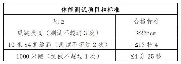 體能測評時間以通知為準(zhǔn)。體能測評項目為縱跳摸高、10米×4往返跑,1000米跑順序進行。三項測試其中兩項通過者視為合格,發(fā)放筆試準(zhǔn)考證。