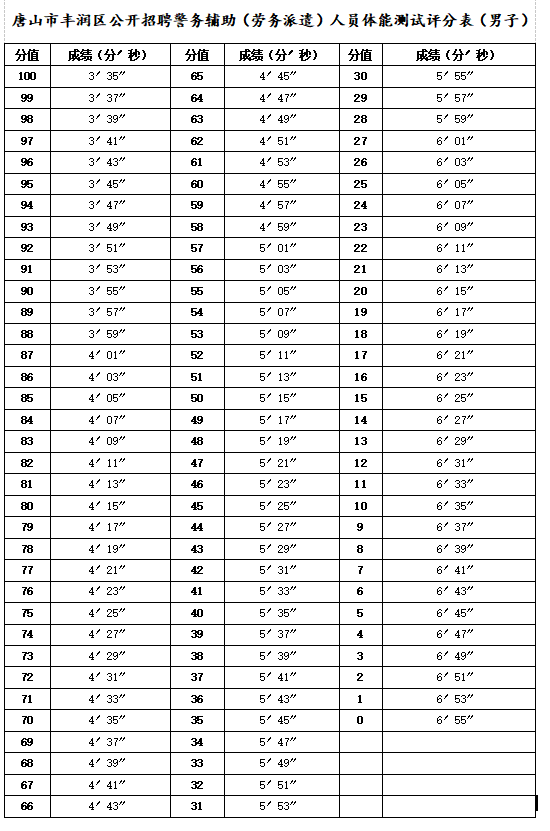(3)測試成績。參考《公安機關錄用人民警察體能測評項目和標準》制定《唐山市豐潤區(qū)公開招聘警務輔助(勞務派遣)人員體能測評評分表》(見附件),總分100分,根據(jù)體能測評所用時間確定排名順序。未跑完全程不計成績。體能測評成績0分的為不合格成績,不進入下一環(huán)節(jié)。體能測評成績通過“豐潤人才發(fā)展集團公開招聘 (http://gkks.frrcjt.com/)”發(fā)布。