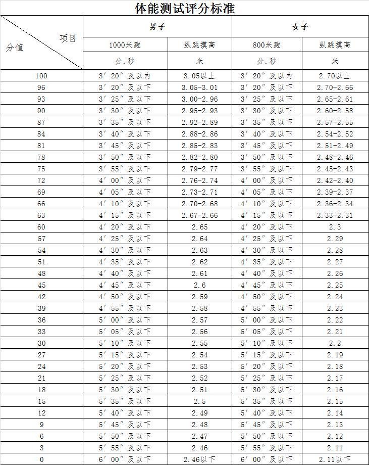 體能測試成績滿分100分。體能測試包括兩個項目:男子1000米跑、女子800米跑和縱跳摸高,每項滿分為100分。測試后,按照兩項各占50%的比例合成體能測試成績。體能測試成績滿60分即為合格,不合格不可參加后續(xù)環(huán)節(jié)。項目及評分標準如下:
