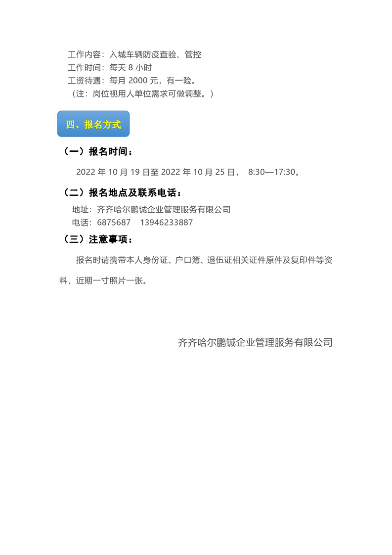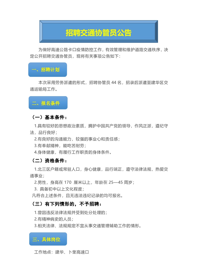 2022-10-21 22:56:46閱讀()齊齊哈爾市建華區(qū)人民政府為做好高速公路卡口疫情防控工作,有效管理和維護(hù)道路交通秩序,決定公開招聘交通協(xié)管員,現(xiàn)將有關(guān)事項(xiàng)公告如下: