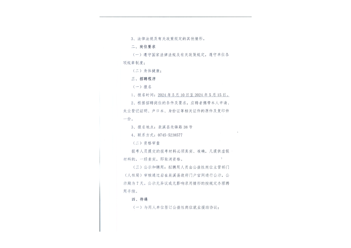 2024-05-12 21:12:49閱讀()辰溪縣人民政府因工作需要,現(xiàn)面向社會公開招聘公益性崗位工作人員1名。