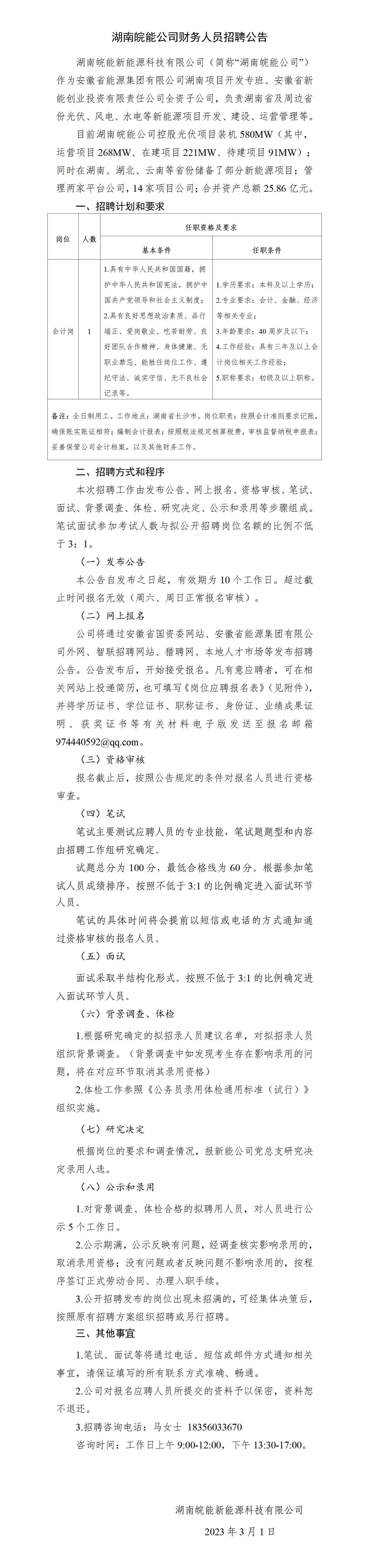 2023年湖南皖能公司財務(wù)人員招聘公告