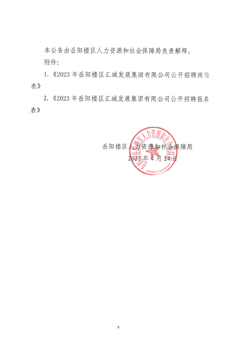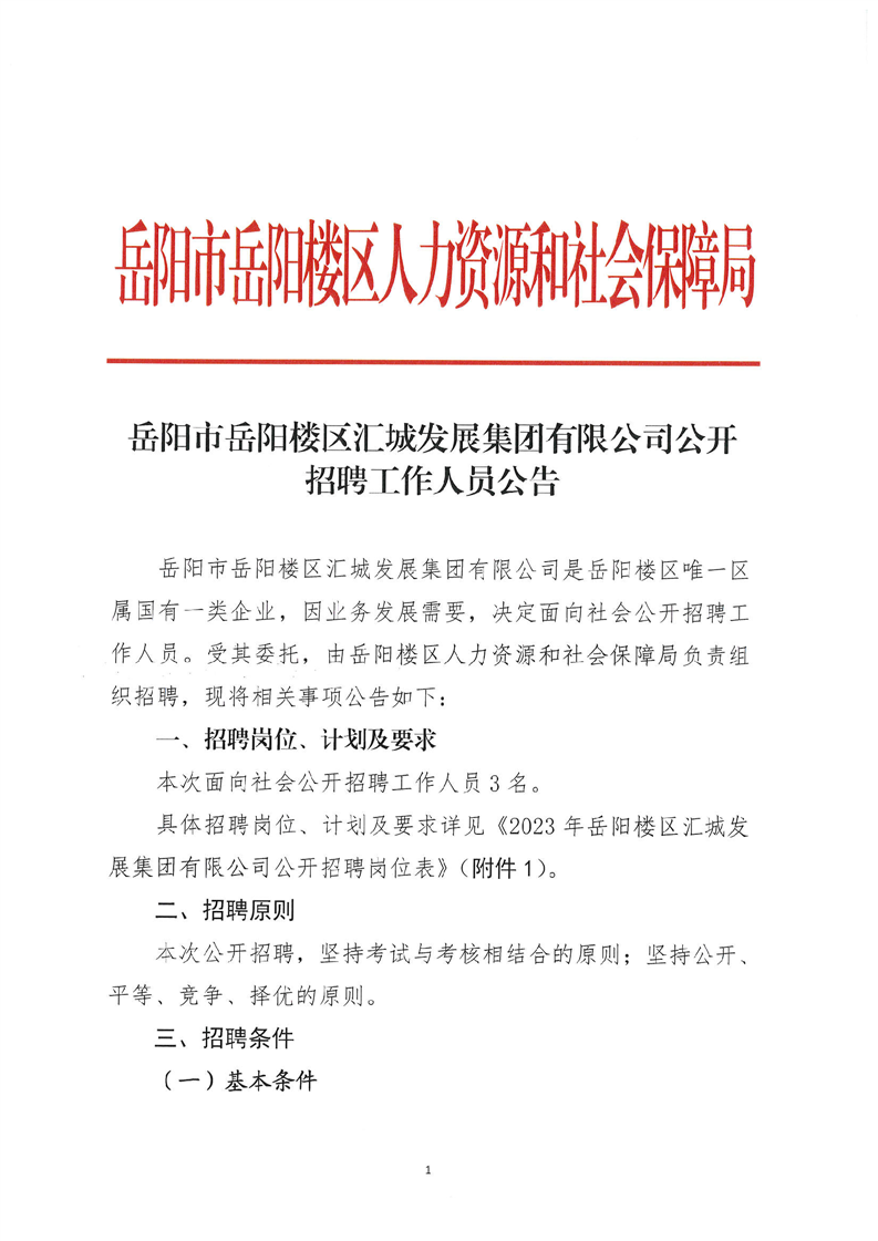 具體招聘崗位、計劃及要求詳見《2023年岳陽樓區(qū)匯城發(fā)展集團有限公司公開招聘崗位表》(附件1)。