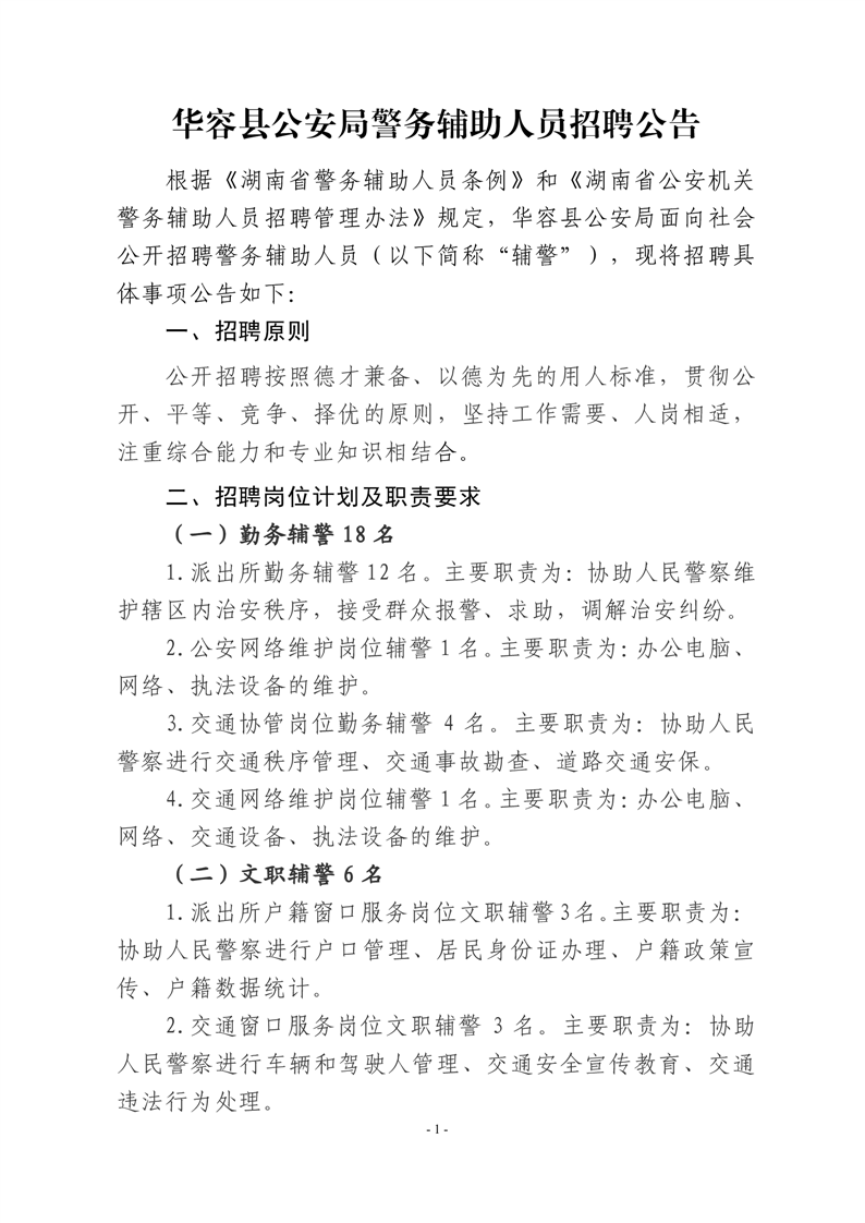 2023-09-20 17:57:55閱讀()華容縣人民政府根據(jù)《湖南省警務(wù)輔助人員條例》和《湖南省公安機(jī)關(guān)警務(wù)輔助人員招聘管理辦法》規(guī)定,華容縣公安局面向社會(huì)公開招聘警務(wù)輔助人員(以下簡(jiǎn)稱“輔警”),現(xiàn)將招聘具體事項(xiàng)公告如下: