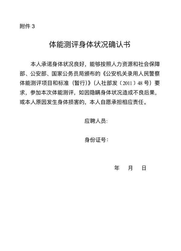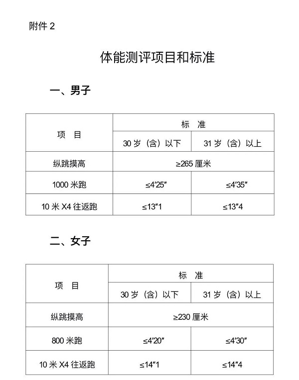 3.體能測(cè)評(píng)項(xiàng)目和標(biāo)準(zhǔn):按照《公安機(jī)關(guān)錄用人民警察體能測(cè)評(píng)項(xiàng)目和標(biāo)準(zhǔn)(暫行)》執(zhí)行,項(xiàng)目為:10米×4往返跑、縱跳摸高、男子1000米跑/女子800米跑,須三項(xiàng)測(cè)試均達(dá)標(biāo)為合格,詳見《體能測(cè)評(píng)項(xiàng)目和標(biāo)準(zhǔn)》(附件2)。不適宜劇烈運(yùn)動(dòng)或有隱形疾病的不得參加體能測(cè)試,否則后果自負(fù);
