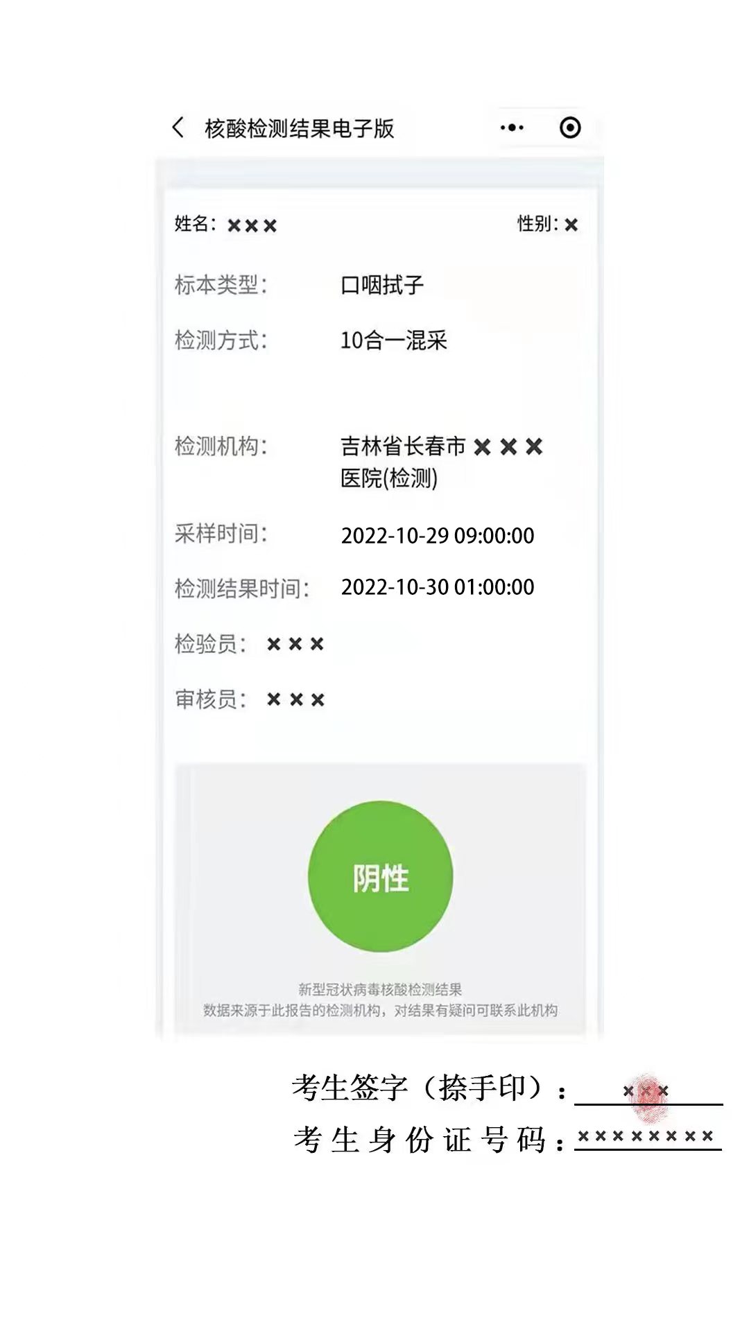 (三)所有應(yīng)試人員在進(jìn)入考點時應(yīng)接受“吉祥碼”“通信大數(shù)據(jù)行程卡”“核酸檢測報告”查驗及體溫測量??忌仨殧y帶入場前24小時內(nèi)(以采樣時間為準(zhǔn))長春市檢測機構(gòu)出具的新冠病毒核酸檢測陰性證明參加考試。證明須為長春市有資質(zhì)的檢測機構(gòu)出具的,能明確顯示核酸檢測報告時間的紙質(zhì)報告或打印紙質(zhì)版的“吉事辦”小程序核酸檢測結(jié)果截圖(圖例見附件5,需注明姓名、身份證號并由本人簽字捺手印)。