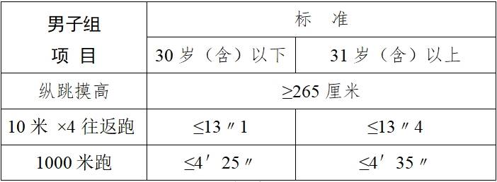 3.體能測評項(xiàng)目及標(biāo)準(zhǔn):本次招聘體能測評共三項(xiàng):縱跳摸高、10米×4往返跑、長跑(男子1000米跑)。體能測評參照《公安機(jī)關(guān)錄用人民警察體能測評項(xiàng)目和標(biāo)準(zhǔn)(暫行)》執(zhí)行,采取達(dá)標(biāo)制。