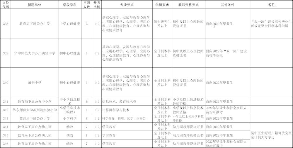 (七)具備《2022年蘇州市吳中區(qū)教育局公開(kāi)招聘教師崗位簡(jiǎn)介表》(見(jiàn)附件)中要求的資格條件,崗位簡(jiǎn)介表中對(duì)招聘崗位基本條件和其他資格條件另有規(guī)定的從其規(guī)定,工作經(jīng)歷計(jì)算的截止時(shí)間為2022年8月31日。