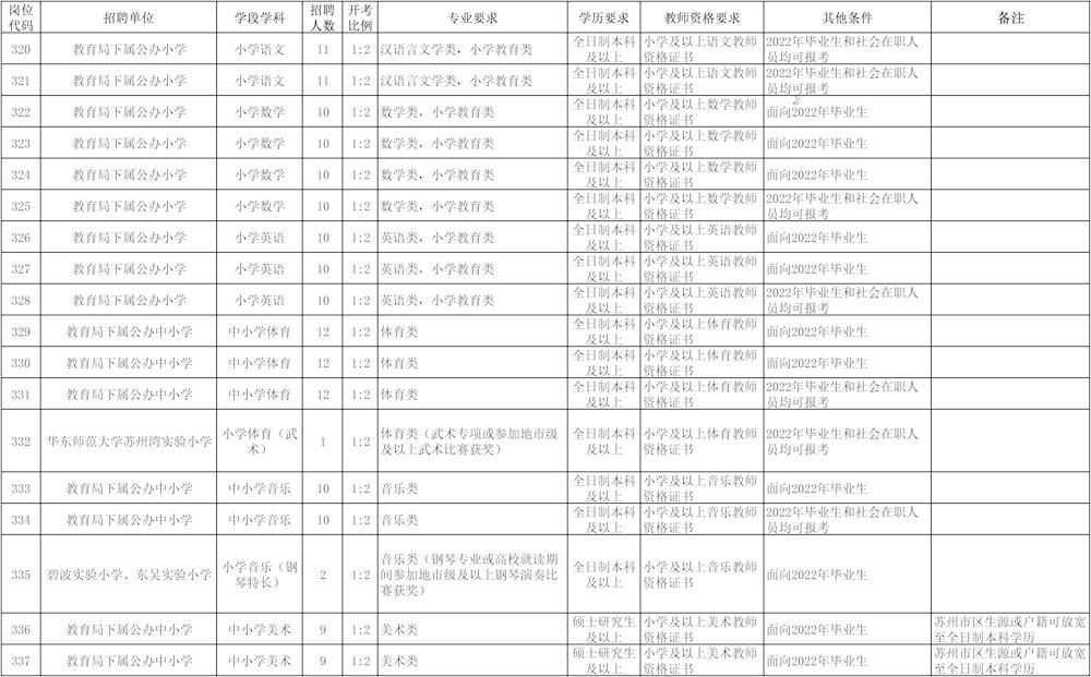 2022-07-19 11:24:09閱讀()蘇州市吳中區(qū)教育局根據(jù)《江蘇省事業(yè)單位公開(kāi)招聘人員辦法》(蘇辦發(fā)〔2020〕9號(hào))和《省教育廳省人力資源和社會(huì)保障廳關(guān)于進(jìn)一步做好全省中小學(xué)校新進(jìn)教師公開(kāi)招聘工作的意見(jiàn)》(蘇教規(guī)〔2016〕1號(hào))有關(guān)規(guī)定,經(jīng)研究決定,2022年蘇州市吳中區(qū)教育系統(tǒng)面向社會(huì)公開(kāi)招聘“年金制”教師334名?,F(xiàn)將有關(guān)事項(xiàng)公告如下: