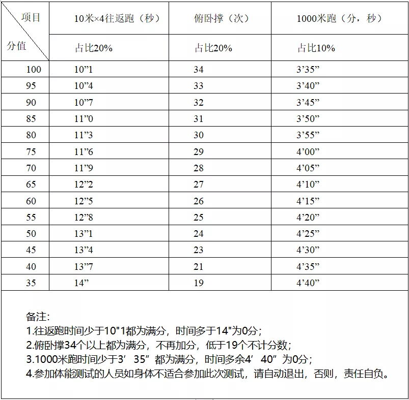 1、勤務類:符合報名條件的人員擇日通知體測、面試,按體測成績占50%、面試成績占50%的比例,采用百分制的方法計算考生總成績(計算到小數(shù)點后兩位,第三位四舍五入。下同)。體測共三項:1000米跑、1分鐘俯臥撐、10×4往返跑,體測標準詳見附件4。
