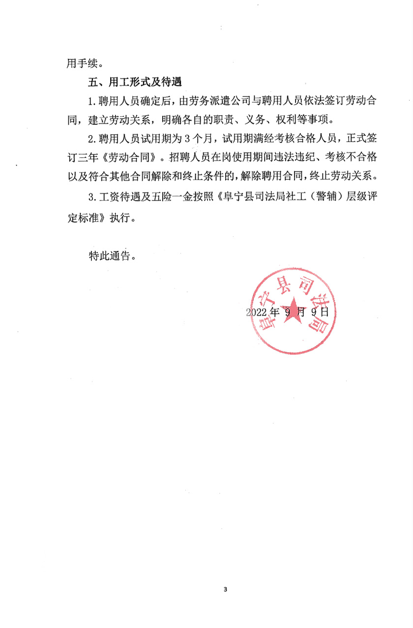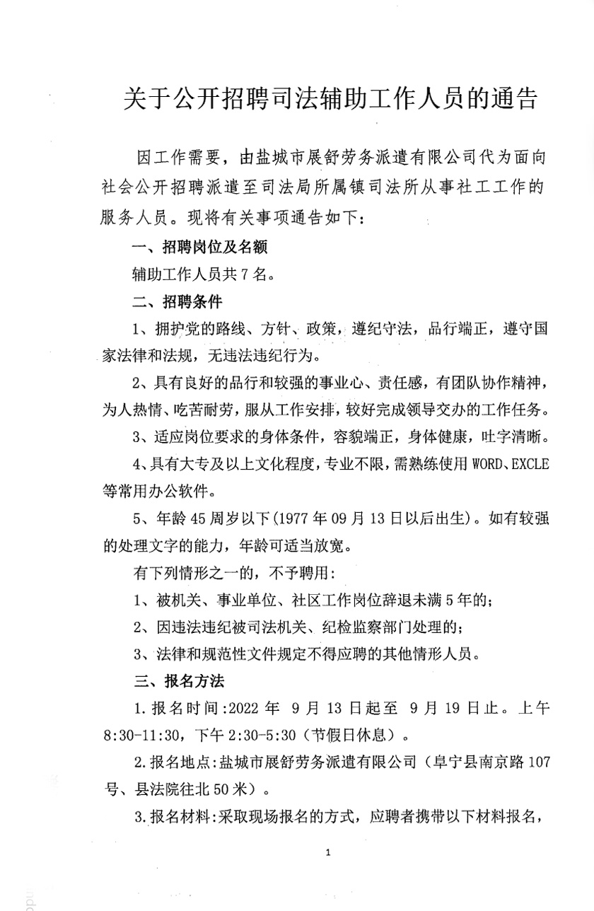 2022-09-19 21:03:19閱讀()阜寧縣人民政府因工作需要,由鹽城市展舒勞務派遣有限公司代為面向社會公開招聘派遣至司法局所屬鎮(zhèn)司法所從事社工工作的服務人員?,F(xiàn)將有關事項通告如下: