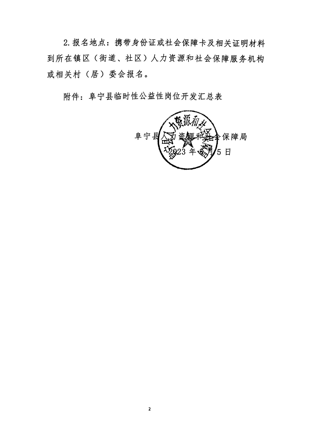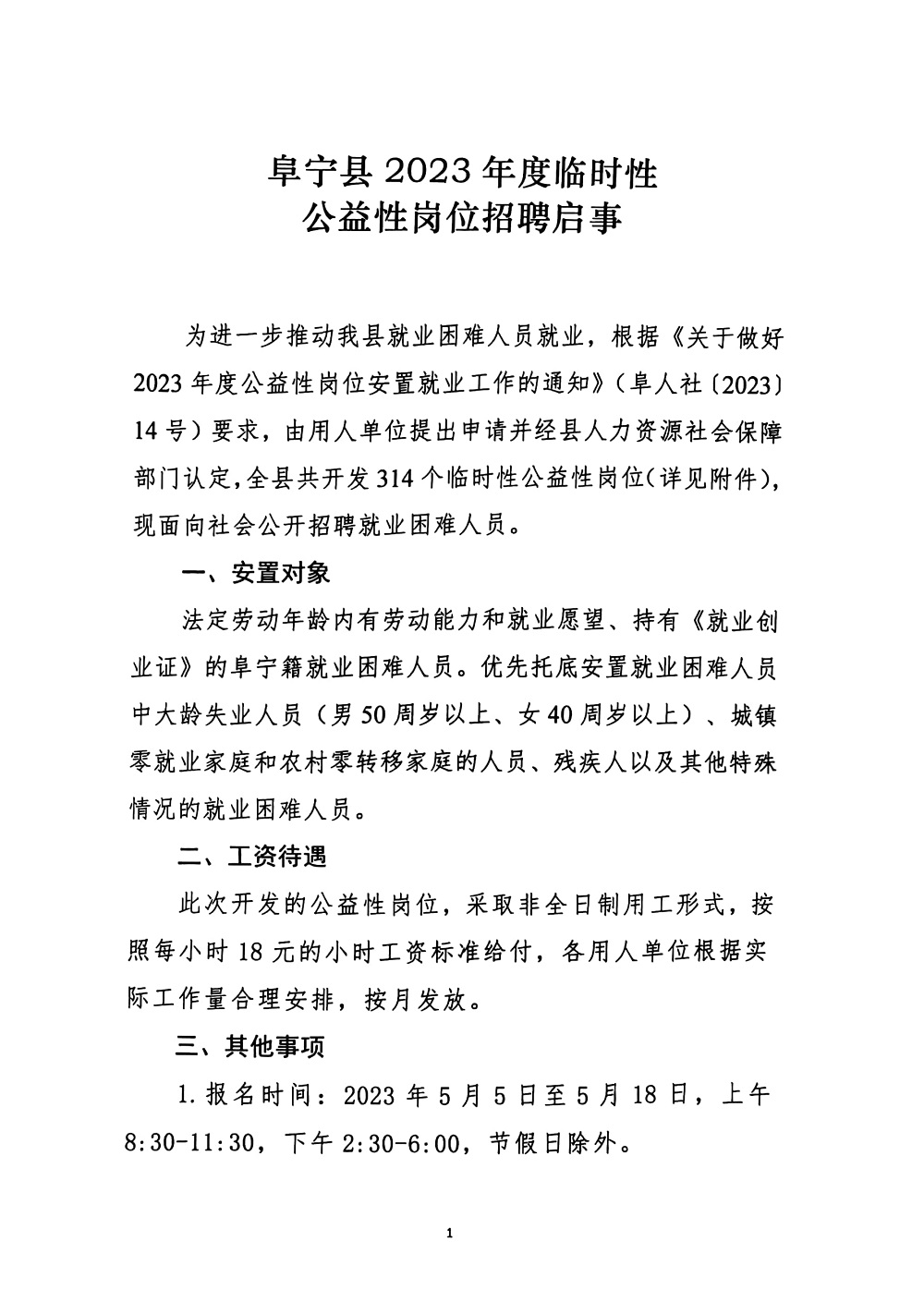 2023-05-06 16:23:32閱讀()阜寧縣人民政府為進(jìn)一步推動(dòng)我縣就業(yè)困難人員就業(yè),根據(jù)《關(guān)于做好2023年度公益性崗位安置就業(yè)工作的通知》(阜人社〔2023)14號(hào))要求,由用人單位提出申請(qǐng)并經(jīng)縣人力資源社會(huì)保障部門認(rèn)定,全縣共開發(fā)314個(gè)臨時(shí)性公益性崗位(詳見附件),現(xiàn)面向社會(huì)公開招聘就業(yè)困難人員。