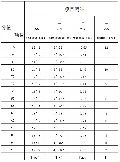 (3)測試項目:1000米跑、100米跑、立定跳遠、引體向上各占25分的權(quán)重分值(評分標準見附件二)。