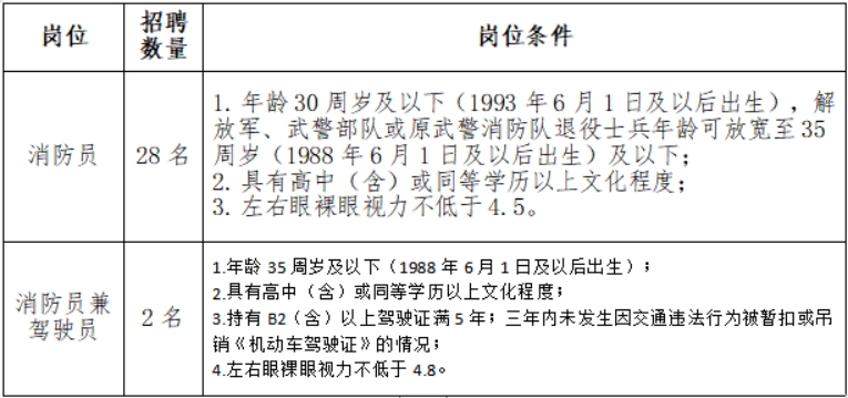 招聘崗位為區(qū)專業(yè)森林消防大隊合同制隊員30名,其中消防員28名(報名人數(shù)須達到1:1.5以上,否則按照比例減少招聘人數(shù)),消防員兼駕駛員2名(報名人數(shù)須達到1:2以上,否則按比例減少招聘人數(shù))。