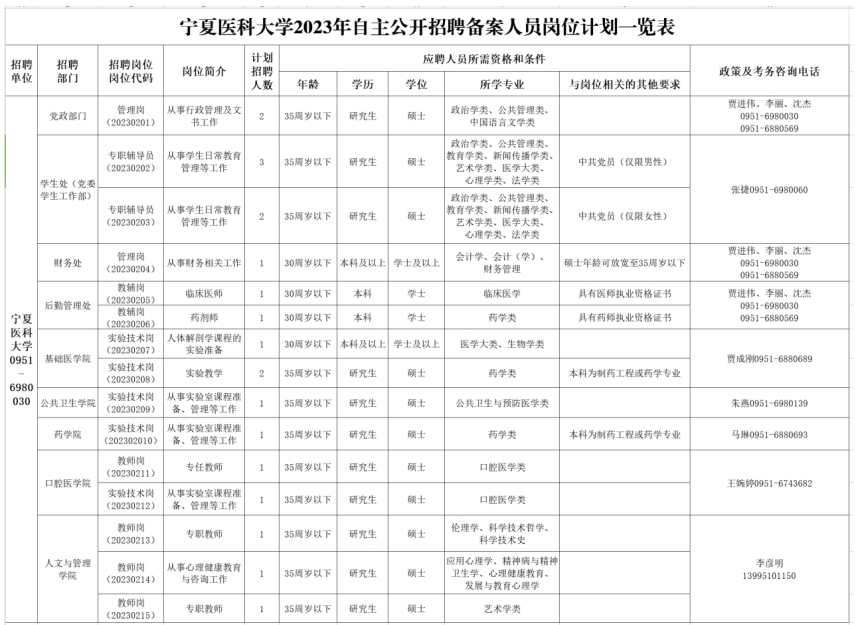 附件:寧夏醫(yī)科大學(xué)2023年自主公開招聘?jìng)浒溉藛T崗位計(jì)劃一覽表