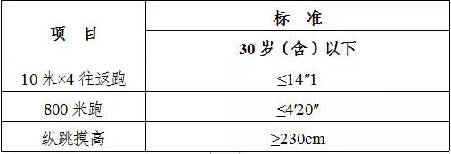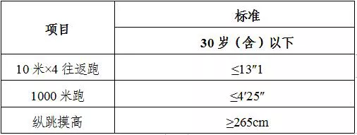(二)體能測評的內容和要求。體能測評參照《公安機關錄用人民警察體能測評項目和標準(暫行)》(人社部發(fā)〔2011〕48號)、國家公務員局《關于明確公安機關人民警察體能測評次數(shù)的函》(國公局函〔2012〕1號)相關要求執(zhí)行。共設三項:男子1000米跑和女子800米跑(測評次數(shù)均為1次)、10米×4往返跑(測評次數(shù)不超過2次)、縱跳摸高(測評次數(shù)不超過3次)。體能測評的三個項目中有任何一項不合格或違規(guī),視為體能測評不合格。