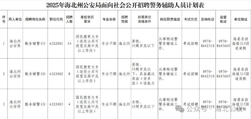 附:2025年海北州公安局面向社會(huì)公開(kāi)招聘警務(wù)輔助人員計(jì)劃表