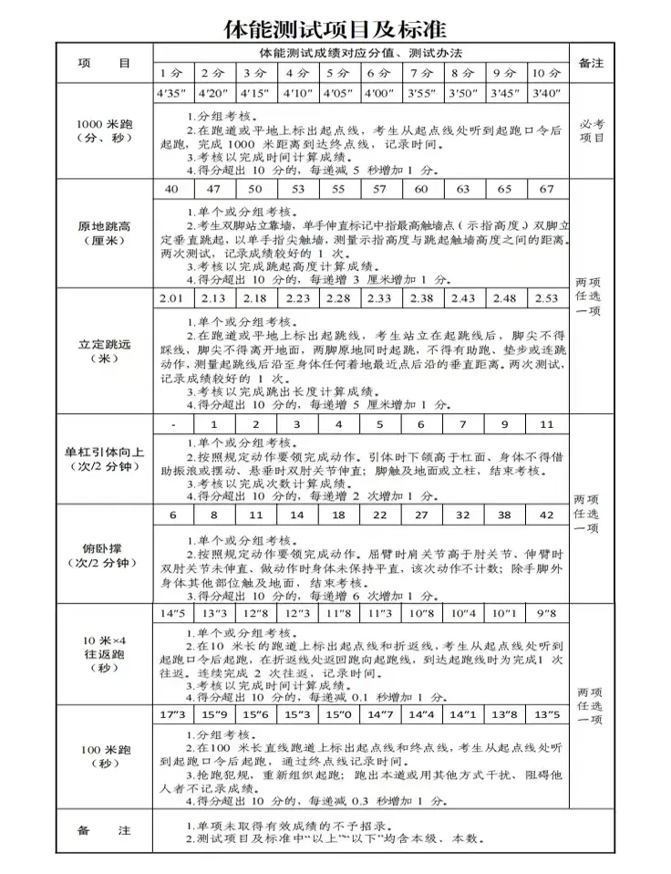01體能、體型測(cè)試:標(biāo)準(zhǔn)參照《國家綜合性消防救援隊(duì)伍消防員招錄體能測(cè)試、崗位適應(yīng)性測(cè)試項(xiàng)目及標(biāo)準(zhǔn)》執(zhí)行??己隧?xiàng)目為:1000米跑必考項(xiàng);原地跳高、立定跳遠(yuǎn),兩項(xiàng)選一項(xiàng);單杠引體向上、俯臥撐,兩項(xiàng)選一項(xiàng);10米×4往返跑、100米跑兩項(xiàng)選一項(xiàng)。主要考察招收對(duì)象肌肉力量、肌肉耐力和爆發(fā)力等。