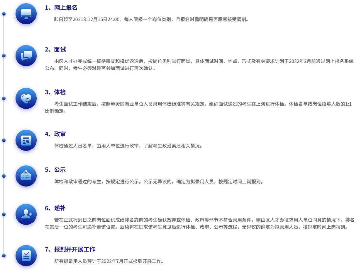 1.選調(diào)生結(jié)合儲備人才項目同步開展,統(tǒng)一采取網(wǎng)上報名,網(wǎng)上報名時間截止到2021年11月10日24:00。 2.在規(guī)定時間內(nèi)成功報名“奉賢區(qū)定向選調(diào)生”的人員,經(jīng)奉賢區(qū)委組織部綜合遴選后,按一定比例擇優(yōu)推薦參加上海市定向選調(diào)考試,與上海市2022年度考試錄用公務(wù)員筆試一并進行(一考兩用,即筆試成績可同時在選調(diào)生招錄和上海市2022年度考試錄用公務(wù)員中使用)。 3.經(jīng)上海市選調(diào)生筆試、面試、體檢、考察、公示、錄用等相關(guān)程序后,辦理選調(diào)生公務(wù)員錄用手續(xù)。錄用職位根據(jù)人崗相適原則,由區(qū)委組織部統(tǒng)一安排。 4.選調(diào)生正式錄用后,區(qū)委組織部負責安排選調(diào)生進行為期兩年的基層培養(yǎng)鍛煉(其中第一年為試用期),按照大學生村官進行管理。試用期滿考核合格的,按照相關(guān)規(guī)定進行轉(zhuǎn)正定級;不合格的,將取消錄用。 5.報名參加選調(diào)的應(yīng)屆畢業(yè)生,應(yīng)如實填報個人信息、提供任職和獲獎證明材料。凡弄虛作假的,一律取消選調(diào)資格。