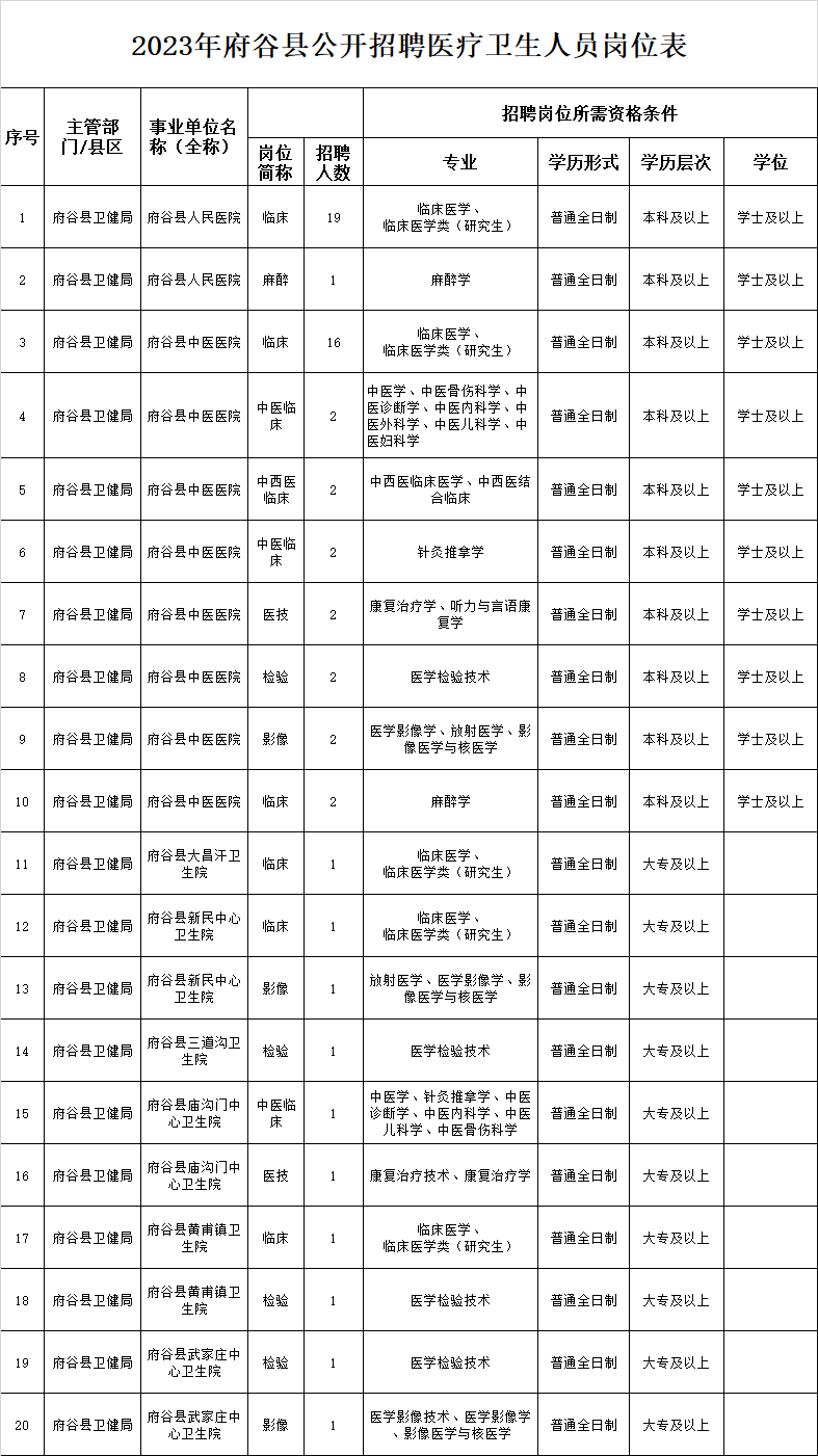 4.符合招聘崗位要求的學(xué)歷、學(xué)位和專業(yè)等條件(詳見附件:《2023年府谷縣公開招聘醫(yī)療衛(wèi)生人員崗位表》);