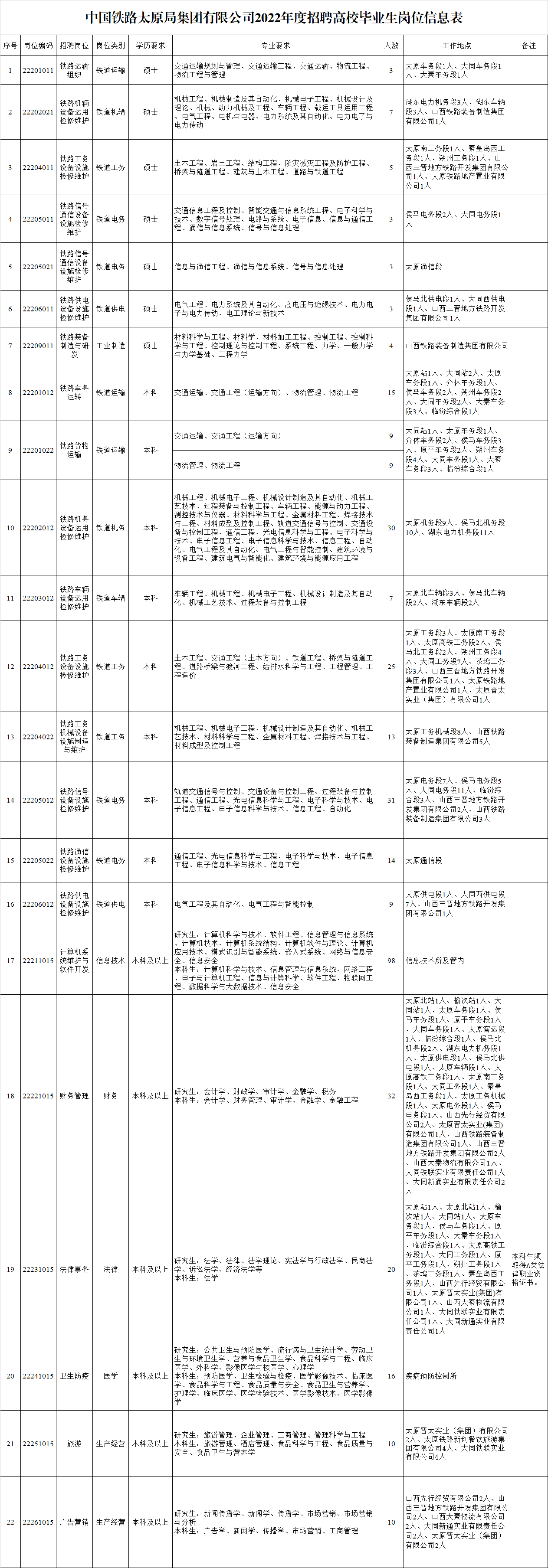招聘崗位、學歷、專業(yè)、人數和工作地點等內容詳見《中國鐵路太原局集團有限公司2022年度招聘高校畢業(yè)生崗位信息表》。
