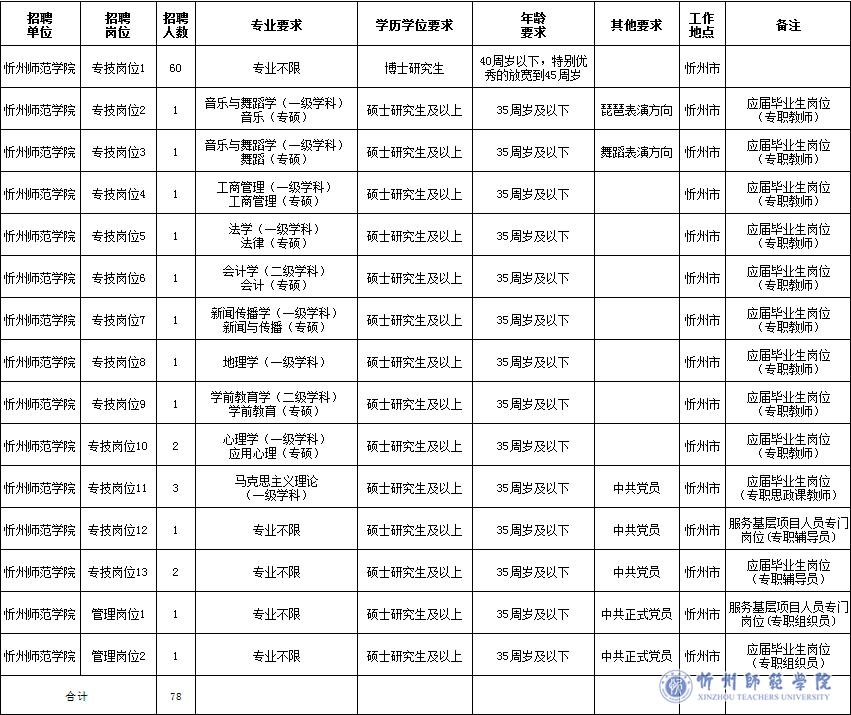 1.忻州師范學(xué)院2021年公開招聘工作人員崗位表