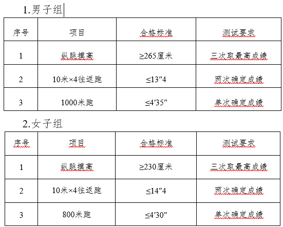 體能測(cè)試項(xiàng)目及合格標(biāo)準(zhǔn)如下: