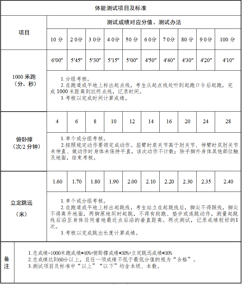 體能測(cè)試科目為1000米跑、俯臥撐、立定跳遠(yuǎn)??偝煽?jī)達(dá)到60分以上,且任一項(xiàng)成績(jī)不低于最低分值的視為“合格”。消防員崗位和駕駛員崗位從事一線滅火救援工作,工作和訓(xùn)練強(qiáng)度高,建議身體存在任何等影響執(zhí)行日常訓(xùn)練及消防救援工作疾病的人員不宜報(bào)考。