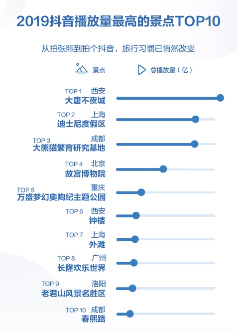 在抖音,一個(gè)人帶火一座城已成獨(dú)特現(xiàn)象。23歲的抖音用戶@皮卡晨化身“不倒翁小姐姐”,掀起握手狂潮,吸引人們爭相實(shí)地打卡。報(bào)告顯示,#大唐不夜城不倒翁#相關(guān)視頻播放量超23億次,西安大唐不夜城景點(diǎn)位列2019抖音播放量最高的景點(diǎn)首位,其次為上海迪士尼度假區(qū)和成都大熊貓繁育研究基地。