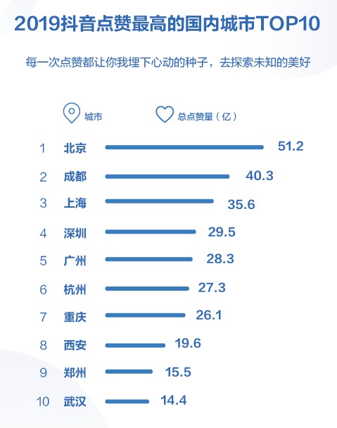 2020-01-07 12:59:00閱讀()抖音2019年,抖音上點(diǎn)贊最多的城市是哪個(gè)?最火的景點(diǎn)在哪里?最流行的音樂、貼紙是什么?不同年齡段用戶喜歡拍攝的內(nèi)容有何變化?1月6日,抖音發(fā)布《2019抖音數(shù)據(jù)報(bào)告》(以下簡稱“報(bào)告”),對以上問題進(jìn)行了解讀。
