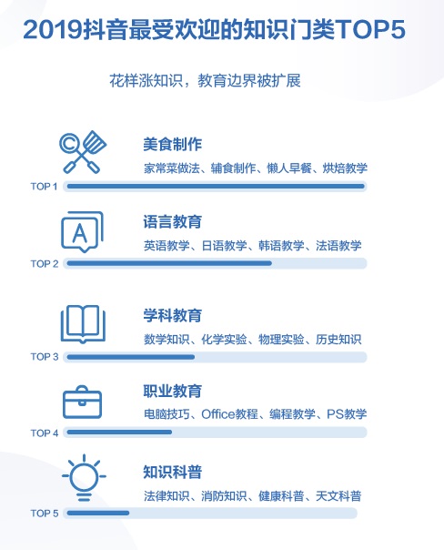 報(bào)告顯示,知識類視頻正成為抖音內(nèi)容生態(tài)的重要組成部分。2019年,抖音萬粉知識創(chuàng)作者發(fā)布1489萬個(gè)視頻,1.3億用戶聽過@向波老師的化學(xué)課。最受歡迎的知識門類是美食制作,人們在抖音學(xué)習(xí)家常菜、輔食、懶人早餐和烘焙等烹飪技巧,其次為語言教育、學(xué)科教育、職業(yè)教育和知識科普,滿足各類人群的學(xué)習(xí)需求。
