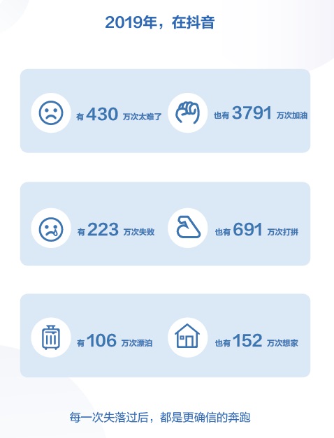 報(bào)告顯示,2019年有46萬個(gè)家庭在抖音拍下全家福視頻,記錄一家人相親相愛的幸福時(shí)刻,相關(guān)視頻被點(diǎn)贊1億次。同時(shí),人們也在抖音記錄下淚水與歡笑,全年抖音上有430萬次“太難了”,也有3791萬次加油;有223萬次失敗,但也有691萬次打拼。