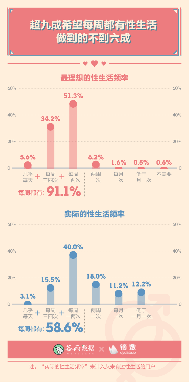 性生活頻率在一周一次以上的比例增長了4.5%,頻率在一月一次的比例下降了4.6%。