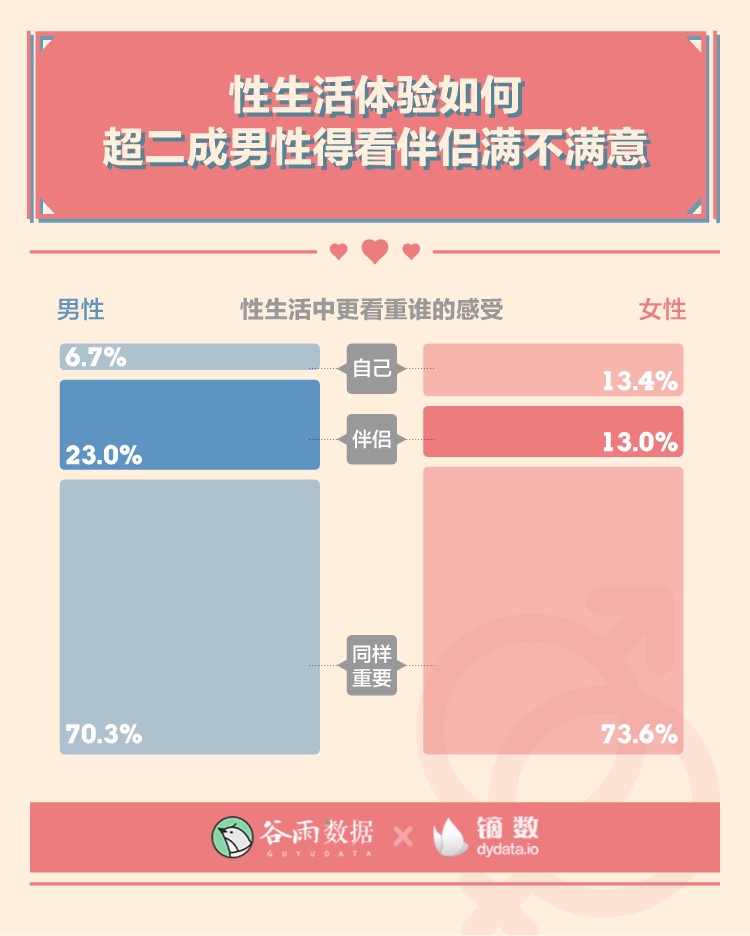 在我們的調(diào)查中,超過七成的人認為性生活中自己和伴侶的感受同樣重要,但分性別看,男性比女性更看重伴侶的感受。