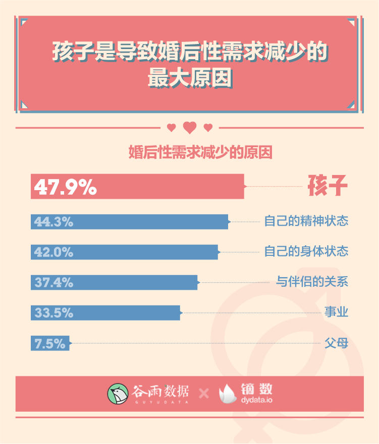 我們的調(diào)查顯示,在所有導致婚后性需求減少的原因中,“孩子”超越了“精神狀態(tài)”、“身體狀態(tài)”、“伴侶關系”等,成為性生活的“頭號殺手”。