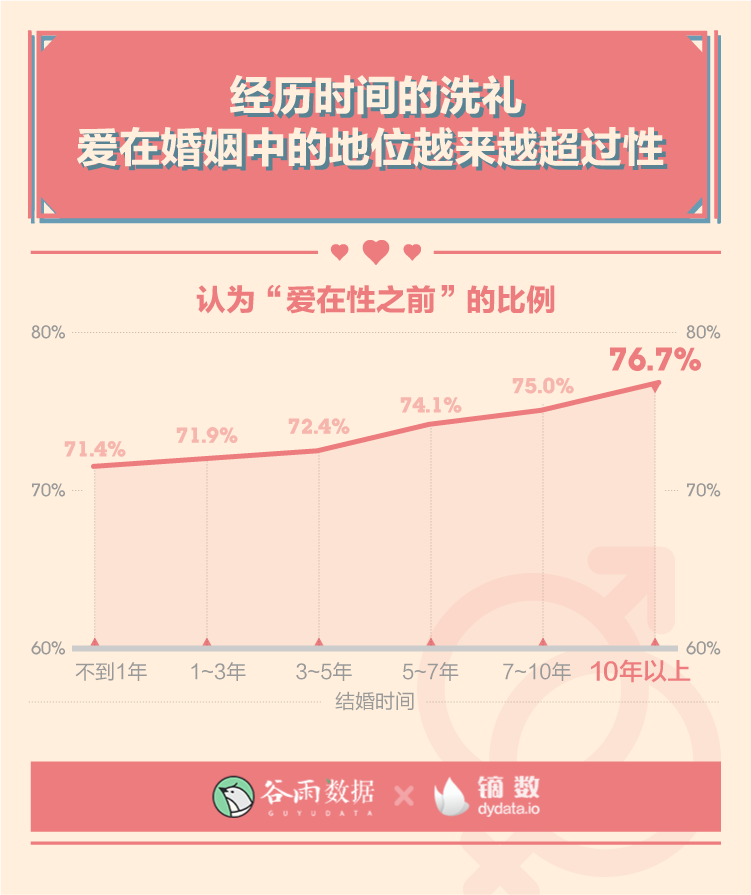 在所有結婚時間段中,結婚10年以上的人認為“愛在性之前”的比例達到最高,為76.7%。