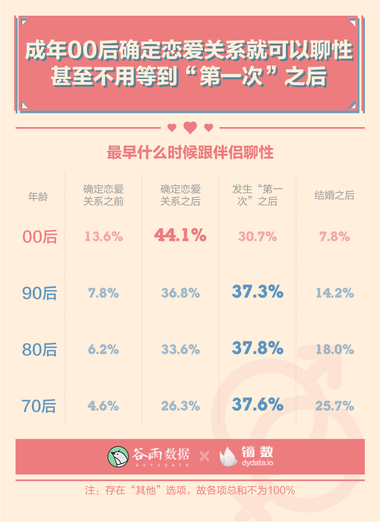 在性表達方面,00后的開放程度的確也更高。44.1%的成年00后認為確定戀愛關系就可以聊性,而其他年齡段更傾向認為要等到發(fā)生“第一次”之后。