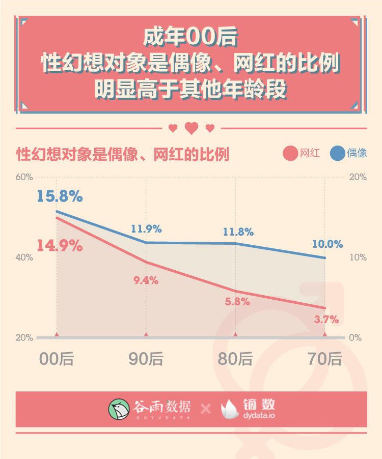 另外,作為網(wǎng)絡時代的“土著”,成年00后們性幻想對象是偶像、網(wǎng)紅的比例也明顯高于其他年齡段。