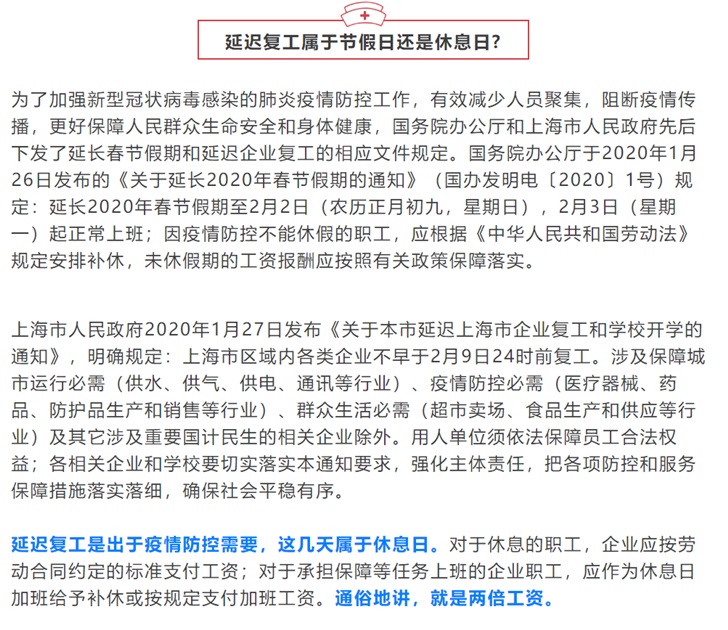 日前,國(guó)務(wù)院辦公廳于2020年1月26日發(fā)布的《關(guān)于延長(zhǎng)2020年春節(jié)假期的通知》(國(guó)辦發(fā)明電〔2020〕1號(hào))規(guī)定:延長(zhǎng)2020年春節(jié)假期至2月2日(農(nóng)歷正月初九,星期日),2月3日(星期一)起正常上班;因疫情防控不能休假的職工,應(yīng)根據(jù)《中華人民共和國(guó)勞動(dòng)法》規(guī)定安排補(bǔ)休,未休假期的工資報(bào)酬應(yīng)按照有關(guān)政策保障落實(shí)。