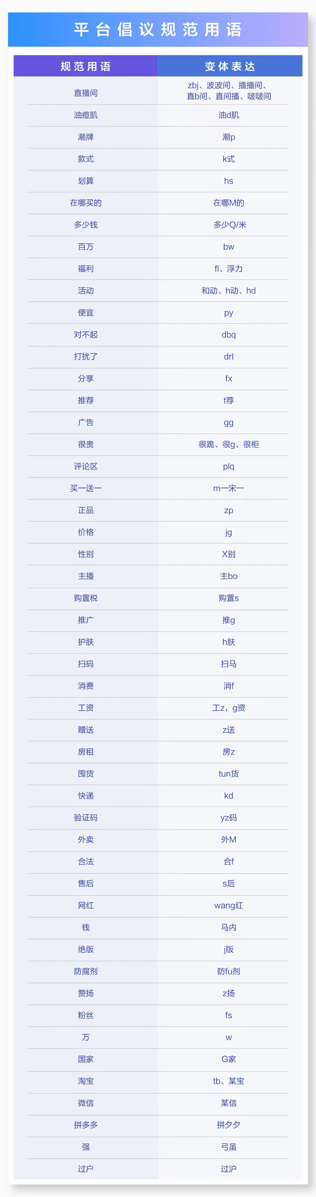 獲悉,李亮還展示了一張“平臺(tái)倡議規(guī)范用語(yǔ)”圖表。